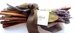 長くしっかりしたシナモンスティック、ラベンダー、ベイリーフ、ホールナツメグを美しいリボンで結び、落ち着いた印象の素敵なディスプレイを作ります。